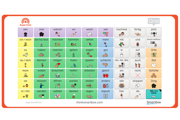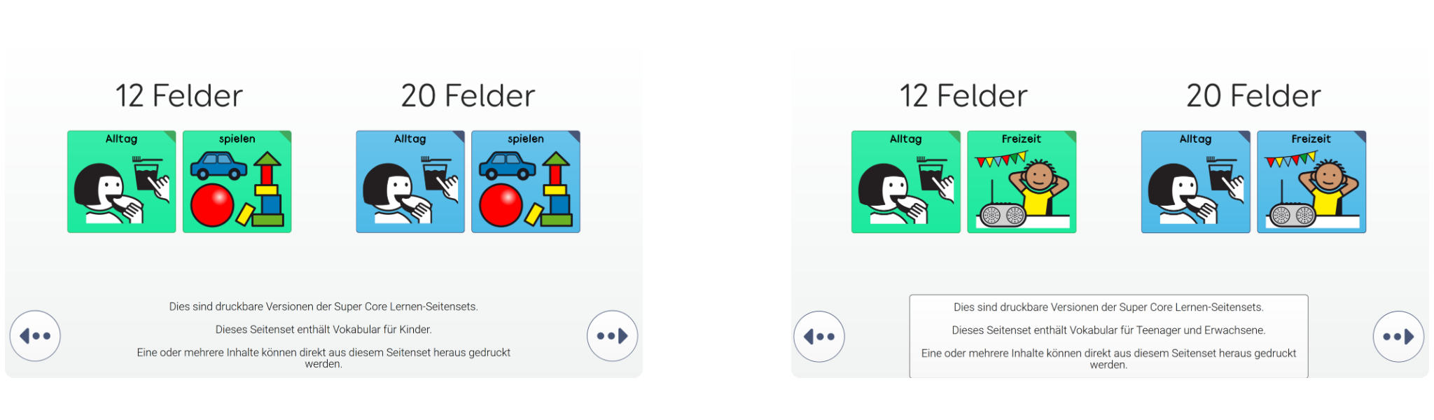 Druckvorlagen sind, wie im Vokabular Super Core Lernen in Grid 3, klar gegliedert in Seitensets für: