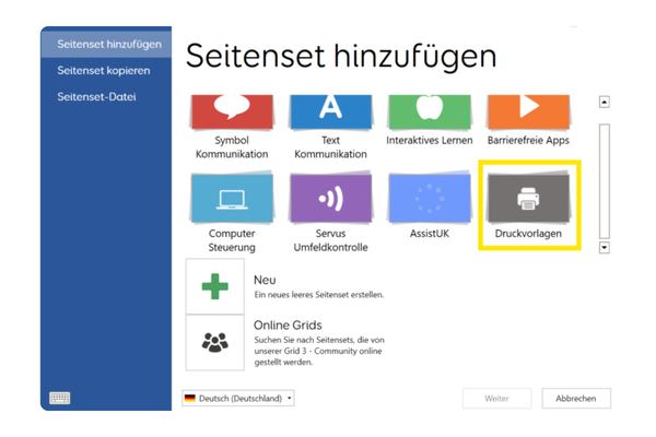 Alle ausdruckbaren Tafeln finden Sie jetzt zentral im Bereich „Druckvorlagen“ im Fenster „Seitenset hinzufügen“ in Grid 3. Darüber hinaus können alle Vokabulare aus Grid 3 heraus gedruckt werden, je nach Bedarf. Die Vorlagen machen das Drucken besonders komfortabel, da sie leicht zu erreichen sind und speziell für diesen Zweck entwickelt wurden.