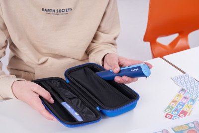 Mit dem verstellbaren Umhängeband kann der Anybook Pro um den Hals getragen oder an auch der Tafel befestigt werden. Dank verstellbarer Länge und Sicherheitsverschluss, der sich bei zu starkem Zug von selbst öffnet, eignet sich das Band für Kinder genauso wie für Erwachsene.