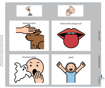 In typischen Spielsituationen können Kinder mit einfachen Kommunikationshilfen teilhaben und etwas bewirken, Entscheidungen treffen über den Spielverlauf, das Spielgeschehen kommentieren, eine Rolle übernehmen, Fragen stellen und beantworten und ihre Symbolkenntnis erweitern-