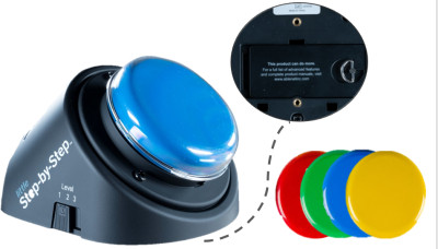 LITTLE Step-By-Step mit Ebenen ist eine um 45° geneigte Sprechende Taste (Ø 60 mm), die beliebig viele Mitteilungen oder Geräusche von maximal vier Minuten Länge wiedergibt. Schritt für Schritt können kleine Geschichten, Geräusche, Witze oder andere Ansagen abgespielt werden. Dank der integrierten Ebenen können drei getrennte Bereiche besprochen werden.