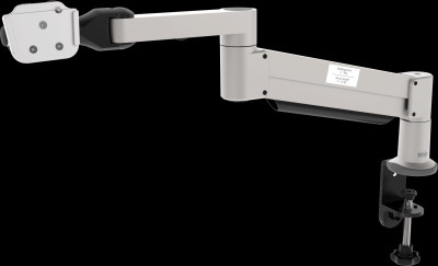 Diese Tischhalterung für Kommunikationsgeräte mit einem Gewicht von zwei bis sechs Kilo lässt sich mit einer Hand seitlich schwenken und in der Höhe verstellen (90° vertikal und 360° horizontal). Das Gewicht des Gerätes wird durch ein Federsystem ausgeglichen.